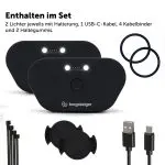 Lieferumfang: 2x wiederaufladbare Kinderwagenlichter, 2x Halterung, 1x USB-C-Kabel