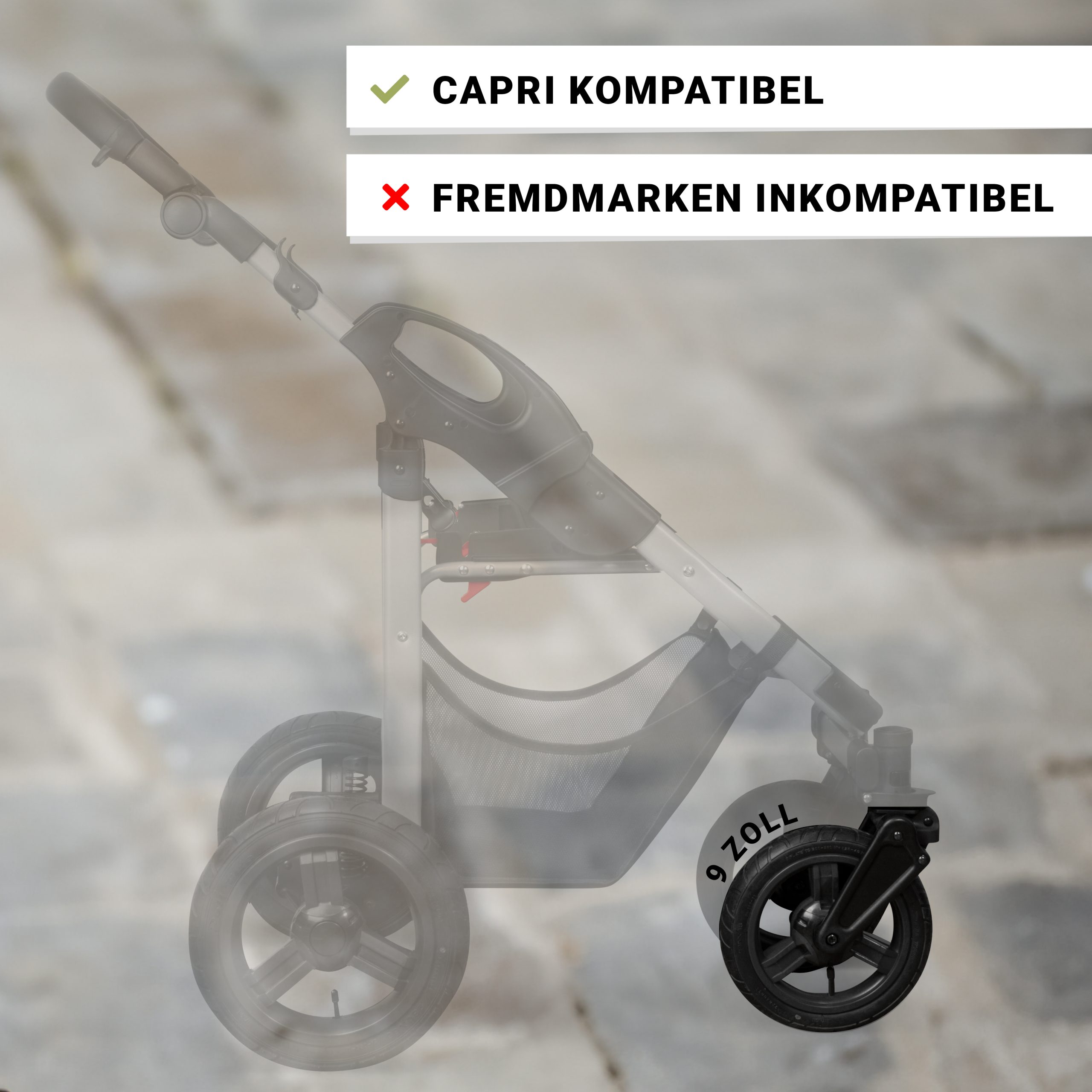 Das 360 Grad Schwenkrad ist für das Modell Bergsteiger Capri geeignet. Es besteht aus der Felge in Chrom-Optik, einem 9 Zoll Schlauch, einem Reifenmantel und der Halterung.
